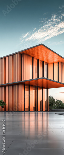 © Chari, Obraz premium Modern geometric copper building stands tall during sunset hour
