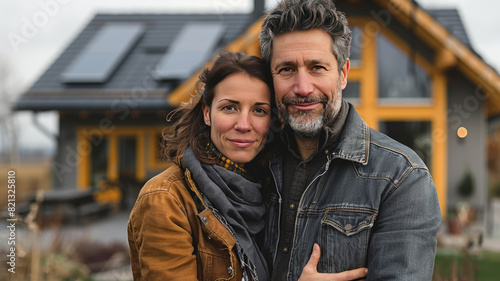 © Krisana, Fototapeta premium Modern German house with black solar panels on the roof. generative ai