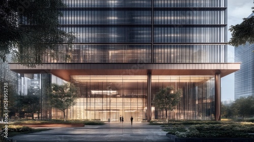 © zulie, Obraz premium Modern glass and bronze skyscraper entrance at dusk.