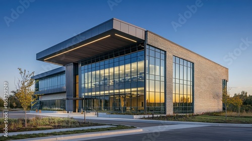 Fototapeta premium Modern glass and stone office building at sunset.