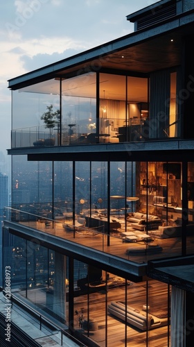 © Ariestia, Obraz premium Modern Glass Apartment Building Evening Cityscape