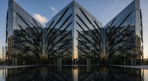 © Ilham, Obraz premium Modern glass building architecture reflecting in water