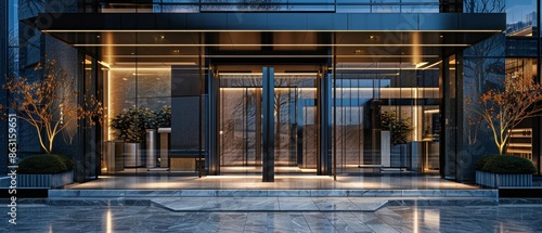 Obraz premium Modern glass building facade with sleek entrance, evening lights, and...