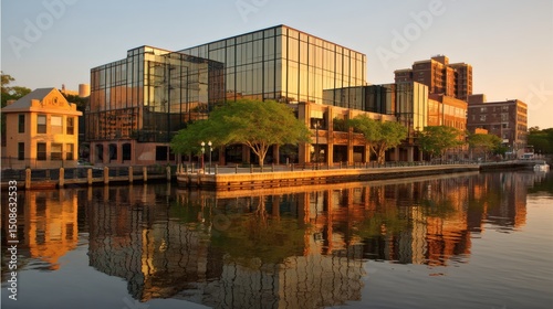 Naklejka premium Modern Glass Building Reflected in Calm River at Sunrise