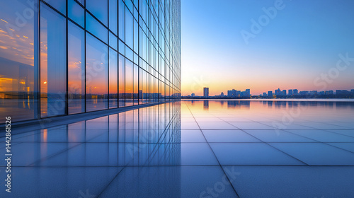 Obraz premium modern glass building reflecting on calm water at sunset, creating serene...