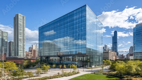 Obraz premium Modern Glass Building Surrounded by Urban Landscape