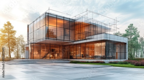 Fototapeta premium Modern glass building under construction in a serene environment.