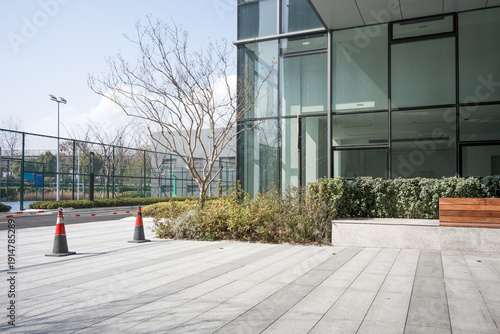 © zhu difeng, Obraz premium Modern glass building with empty paved plaza and landscaped greenery in daylight