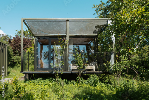 © brizmaker, Obraz premium Modern glass cabin nestled in lush green landscape during bright daytime