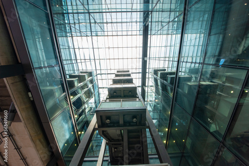 © 一飞 黄, Obraz premium Modern glass elevator and pedestrian stairway entrances.