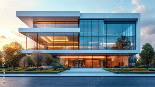 © sumbayana, Fototapeta premium Modern Glass Facade Building with Sunset Sky and Lush Landscaping