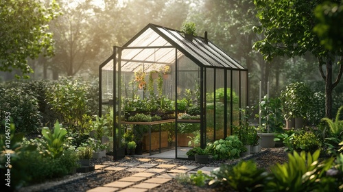 Fototapeta premium Modern Glass Greenhouse in a Lush Garden
