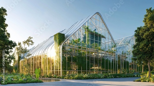 Fototapeta premium Modern glass greenhouse, urban farming, sunlight, plants, sustainable architecture
