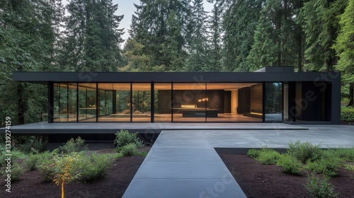 Fototapeta premium Modern glass house, forest setting, paved walkway.