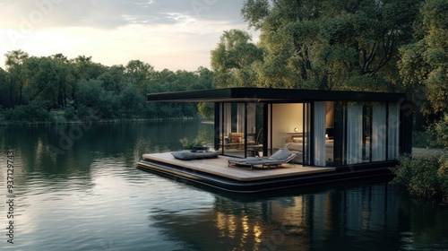 © Iswanto, Fototapeta premium Modern glass house on a lake with sunset light.