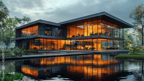 © darion, Obraz premium Modern glass house reflecting in a serene pond at dusk.