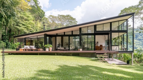 © Puttipong, Fototapeta premium Modern Glass House Surrounded by Lush Greenery