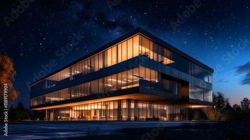 Obraz premium Modern Glass Office Building at Night Under Stars