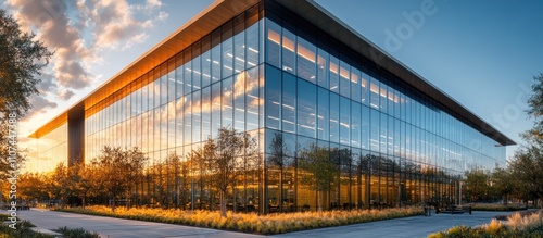 © Almahyra, Obraz premium Modern glass office building at sunset. (1)