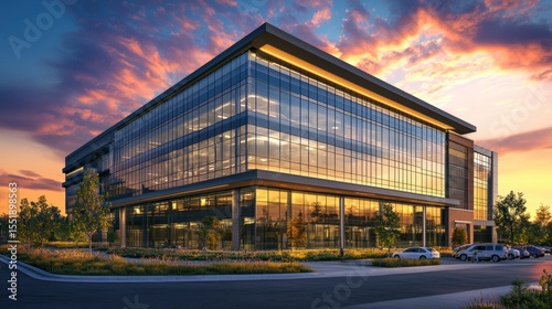 © cllareta, Obraz premium Modern glass office building at sunset.