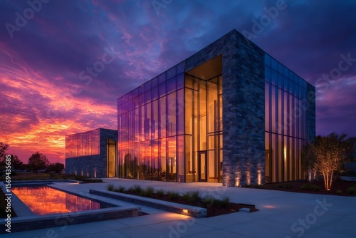 © Oleh, Obraz premium Modern glass office building reflecting vibrant sunset at twilight