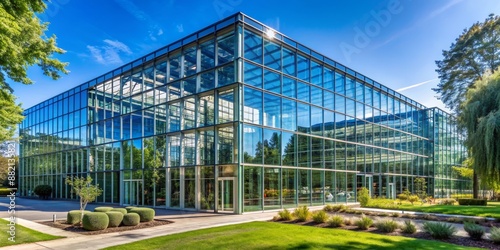 Obraz premium Modern Glass Office Building with Blue Sky and Greenery, architecture,...