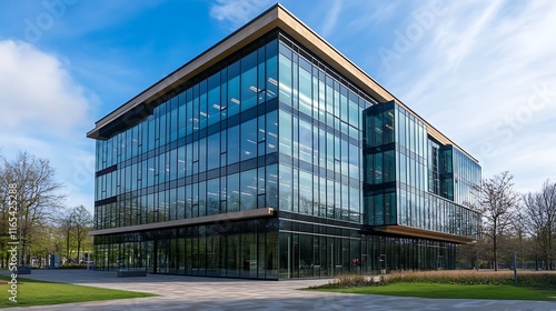 © HPMP Studio, Fototapeta premium Modern glass office building with clear blue sky background