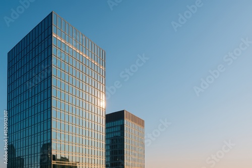 © mankong, Obraz premium Modern Glass Office Buildings Under Clear Blue Sky with Reflections and Contemporary Architecture Design Elements
