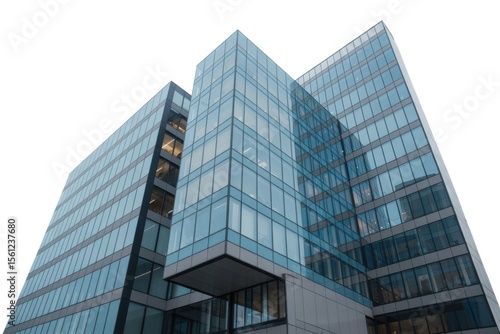 © MAJIDULISLAM, Fototapeta premium Modern glass office buildings with blue tinted windows reflecting the sky and surrounding structures against a white background