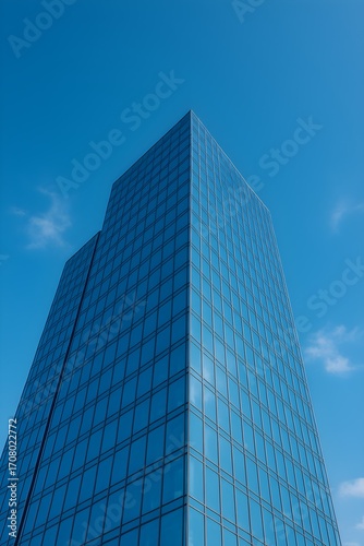© AbdulQadir, Fototapeta premium Modern glass skyscraper against clear blue sky