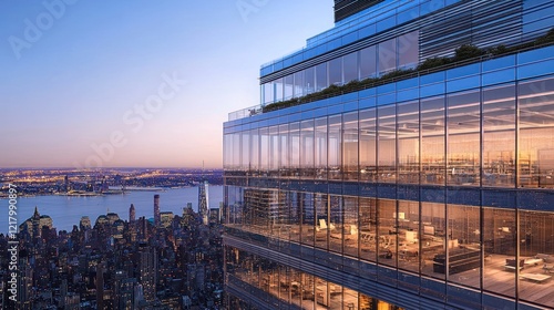 © jaargib, Fototapeta premium Modern glass skyscraper at sunset, city view. (5)