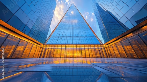 © Bassmallah, Fototapeta premium Modern glass skyscrapers at sunset, reflecting in plaza.