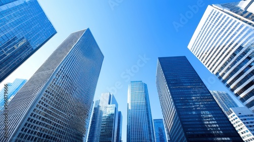Obraz premium Modern Glass Skyscrapers Upward View Blue Sky Urban Architecture