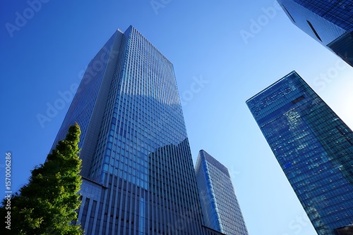 Obraz premium Modern glass skyscrapers with lush green tree against a clear blue sky