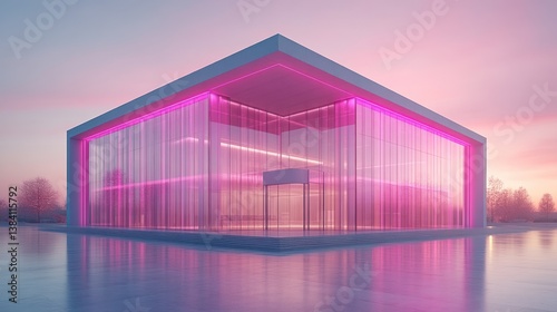 © Fajr Studio, Fototapeta premium Modern Glass Structure with Pink Neon Lighting at Sunset