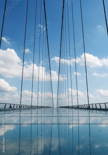 © Putra, Fototapeta premium Modern glass suspension bridge reflecting sky, clouds, and cables