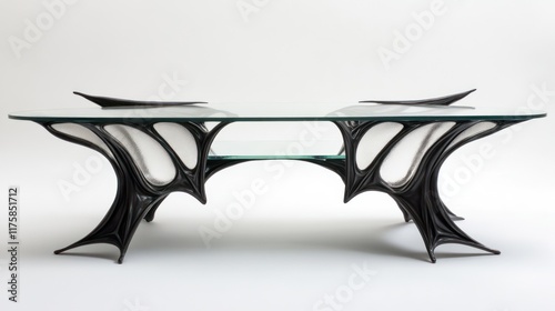 Fototapeta premium Modern glass-top coffee table with black organic sculpted base.