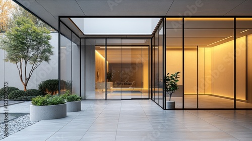Obraz premium Modern glass-walled interior courtyard with minimalist design and garden.