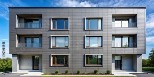 © InspireStock Gallery, Fototapeta premium Modern gray building with large windows and balconies