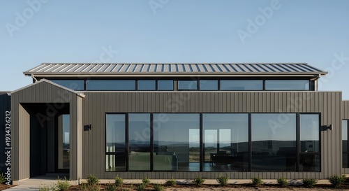 Obraz premium Modern Gray Home with Large Windows Reflecting the Sky and Surrounding Landscape