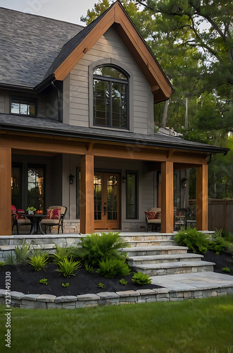 © MatandSterre, Obraz premium Modern Gray House with Wooden Porch and Stone Steps. Luxury Real Estate, Contemporary Home Exterior Design, Beautiful Landscaping