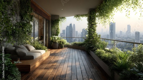 © Zahfran, Fototapeta premium Modern Green Balcony Overlooking Cityscape View with Natural Light Design