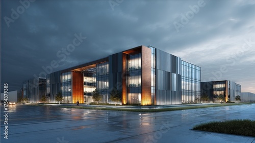 Obraz premium Modern Green Industrial Park Building Exterior with Geometric Design