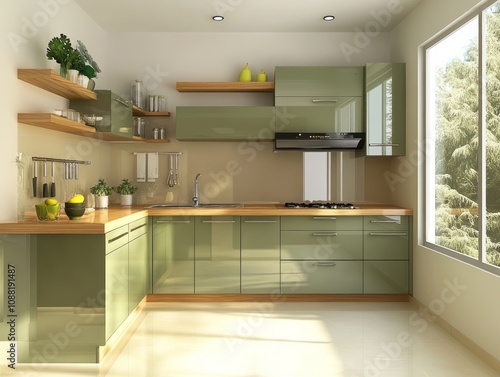 Fototapeta premium Modern Green Kitchen Design With Wooden Accents