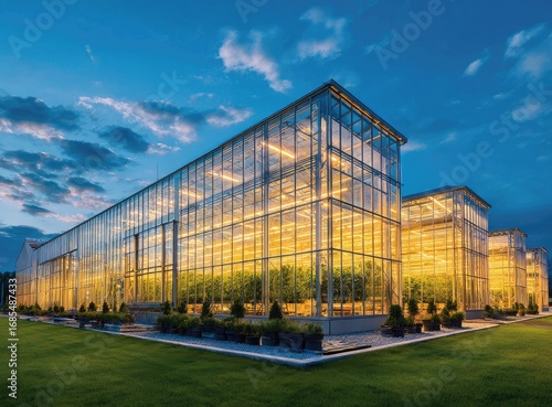 Obraz premium Modern greenhouse complex at twilight