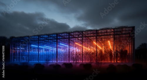 Obraz premium Modern greenhouse illuminated with blue and orange lights at night