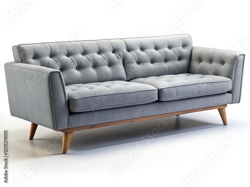 © Wanlop, Fototapeta premium Modern Grey Button Tufted Sofa with Angular Wooden Legs - Isolated on White Background