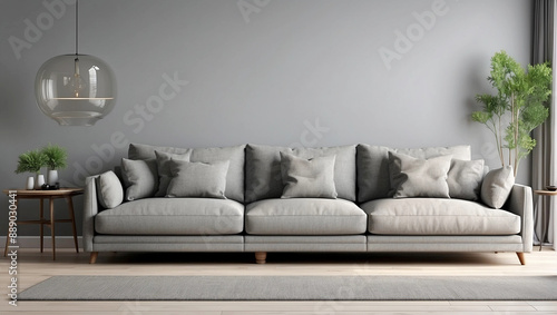 © Tarikulsio, Fototapeta premium Modern grey sofa in living room on white background. 3d rendering, Ai generative