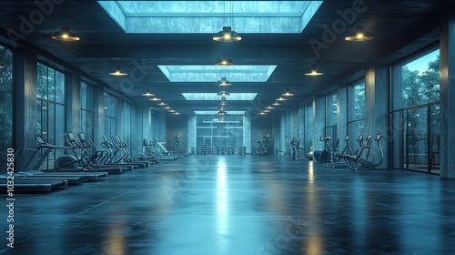 Fototapeta premium Modern gym interior with treadmills, exercise bikes, and large windows...