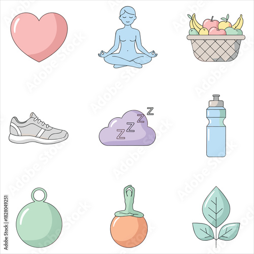 Naklejka premium Modern health and wellness concept icons for balanced lifestyle isolated on...